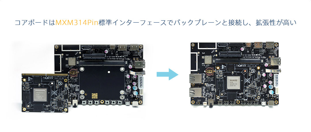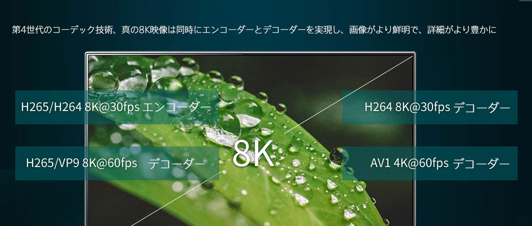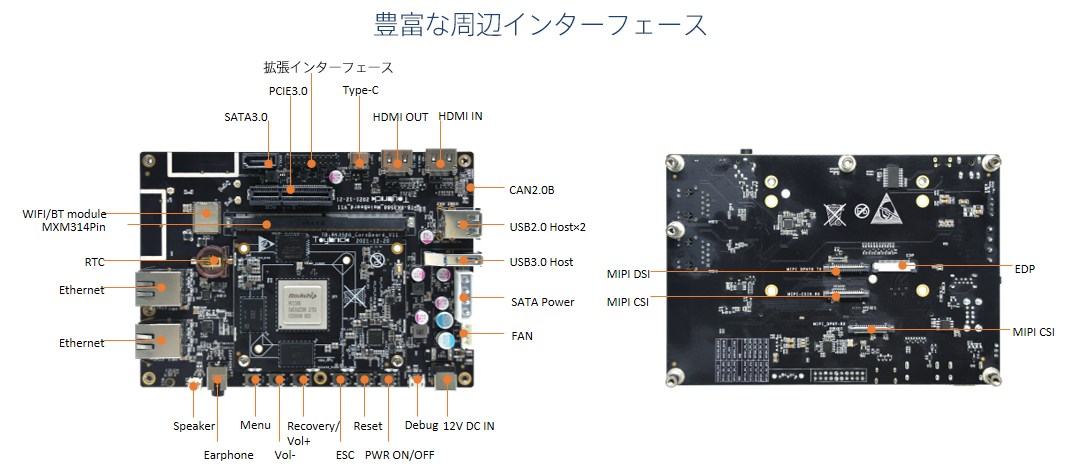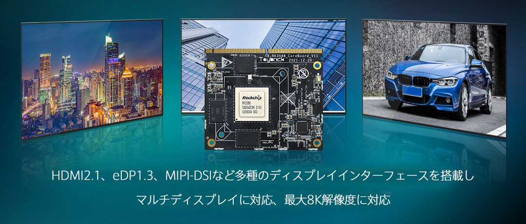 | ディスプレイ | 1x HDMI2.1(Type-A)インタフェース,8K/60fps対応 1x MIPIインタフェース,4K@60fps対応 1x eDPインタフェース,4K@60fps対応 1×DPインタフェース,8K@30fps対応 1×HDMI in,4K@60fps対応 |