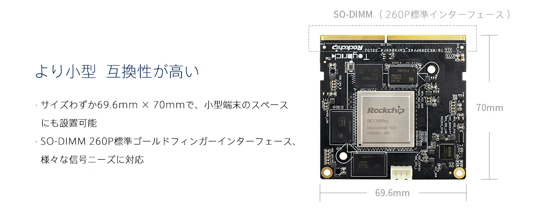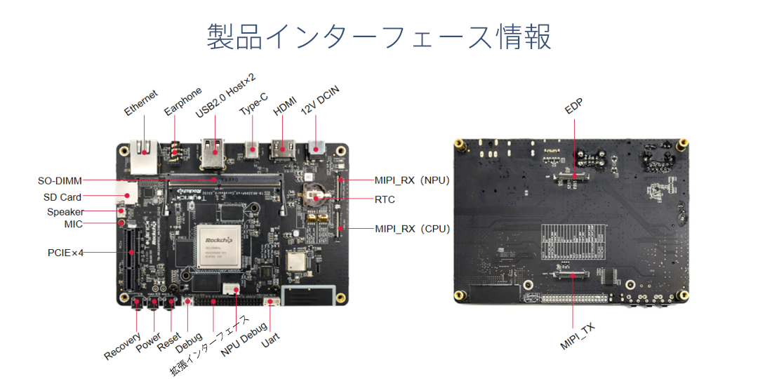| カメラ | 2*MIPI-CSIカメラインタフェース (CPU側:up to13Mpixel NPU側:up to 2Mpixel) |