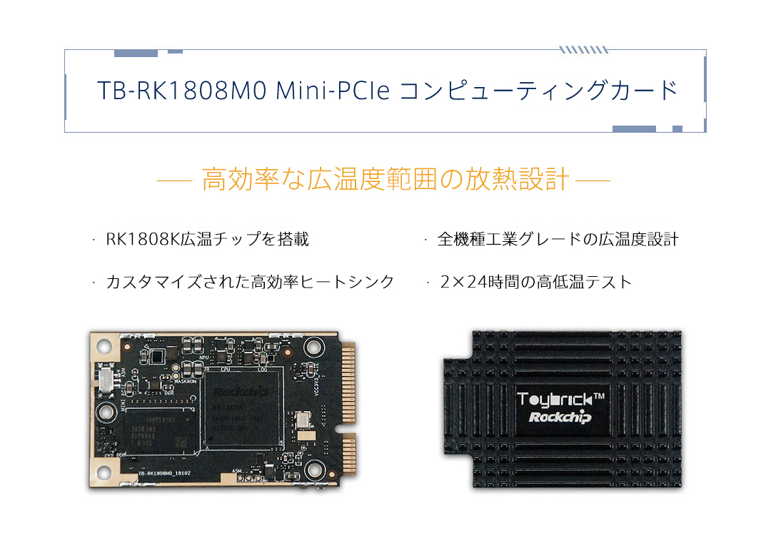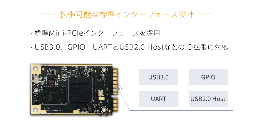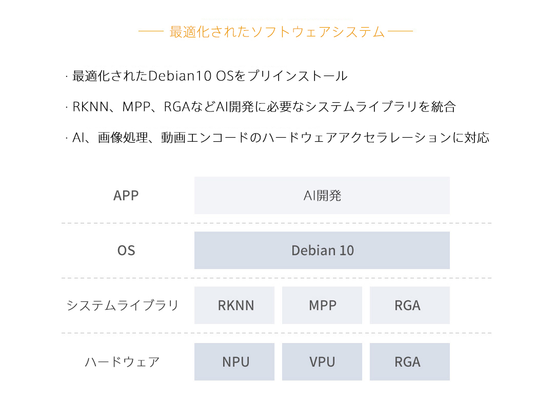 | NPU | • 3.0TOPs for INT8/300??GOPs for INT16/100GFLOPs for FP16 • IN8/INT16/FP16対応 • TensorFlow、Caffe、ONNXとDarknetモデル対応 |