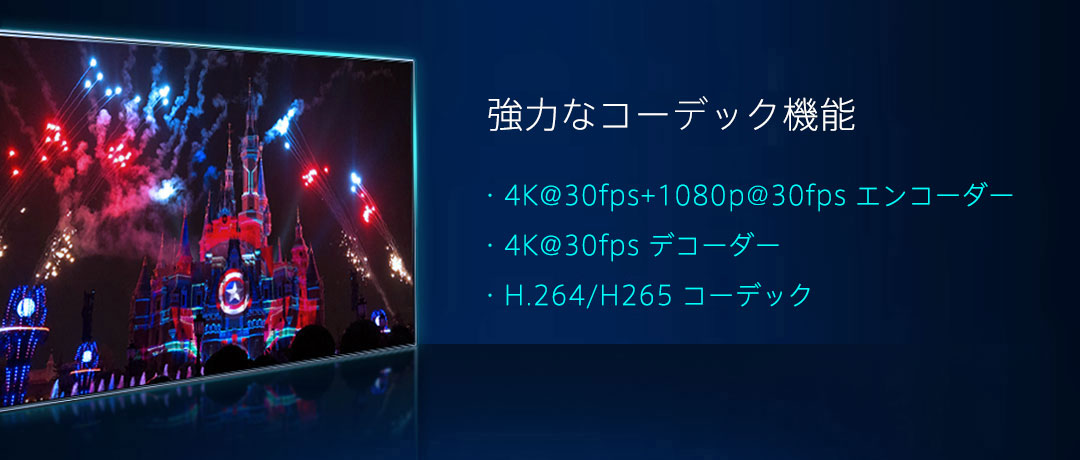 | VPU | 4K H.264/H.265 30fps ビデオエンコーダー 3840×2160@30fps+1080@30fps エンコーダー 4K H.264/H.265 30fps ビデオデコーダー 3840×2160@30fps エンコーダー+3840×2160@30fps デコーダー |