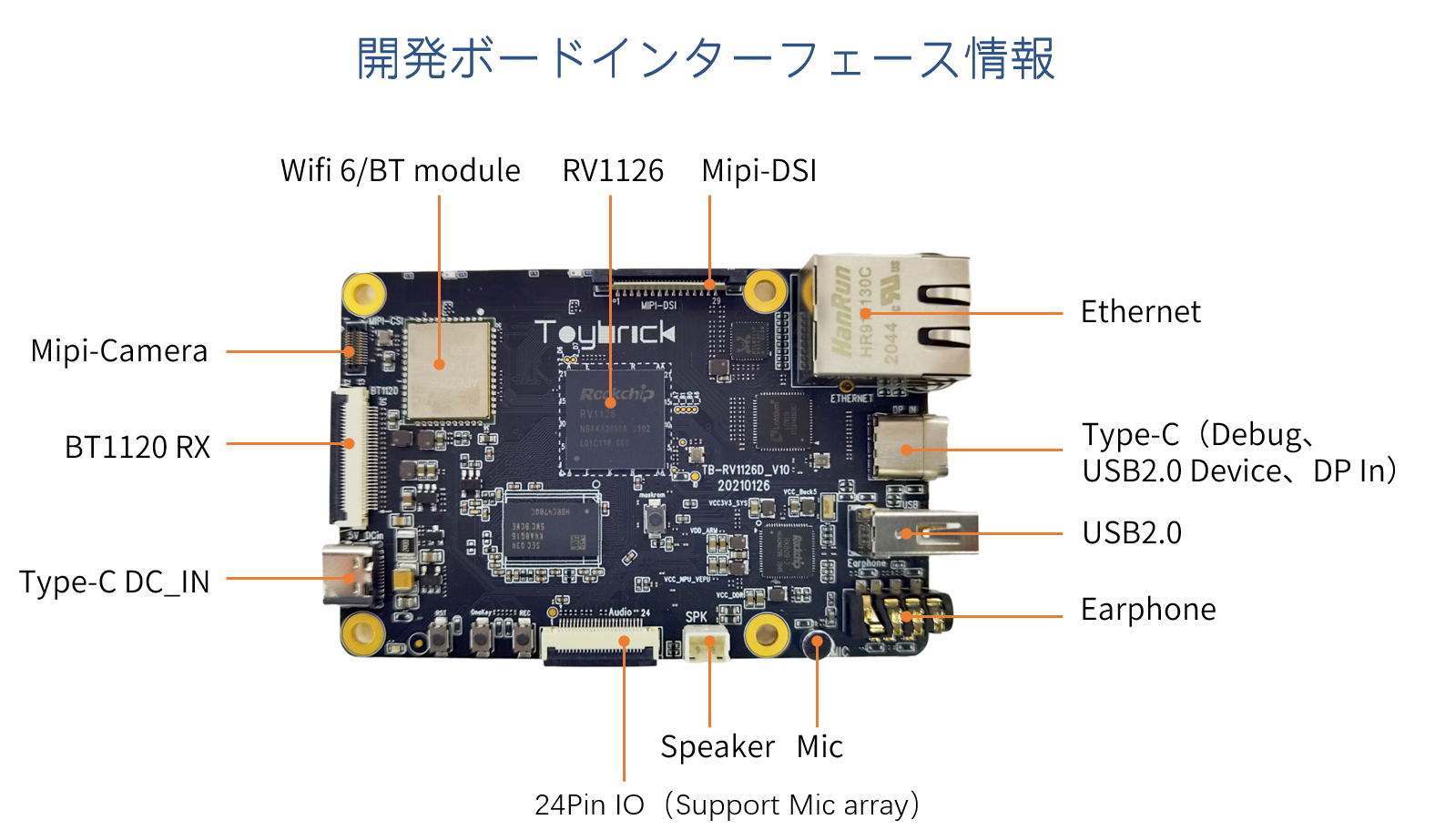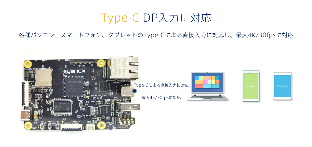 | Audio | 1×DPオーディオ出力 1×headphone、オーディオ出力用 1×microphone、 on boardオーディオ入力 1×8ch I2S、マイクアレイ対応 |